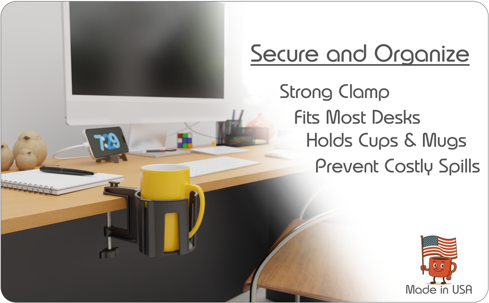 Stay focused through your busiest hours. The Cup-Holster strong clamp fits most desks and holds cups, mugs, bottles, or tumblers safely in place. Prevent costly spills while keeping your workspace organized and clutter-free.